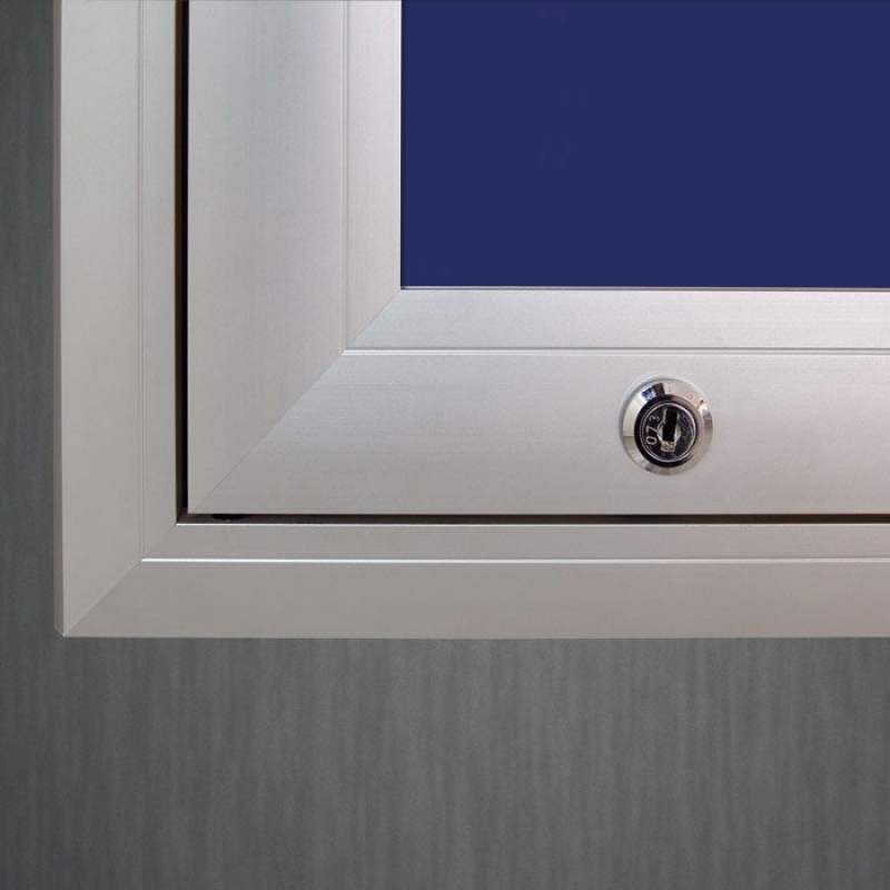 Elegancka o nowoczesnym wzornictwie gablota wykonana z odpowiednio zaprojektowanych profili aluminiowych anodowanych na kolor srebrny.